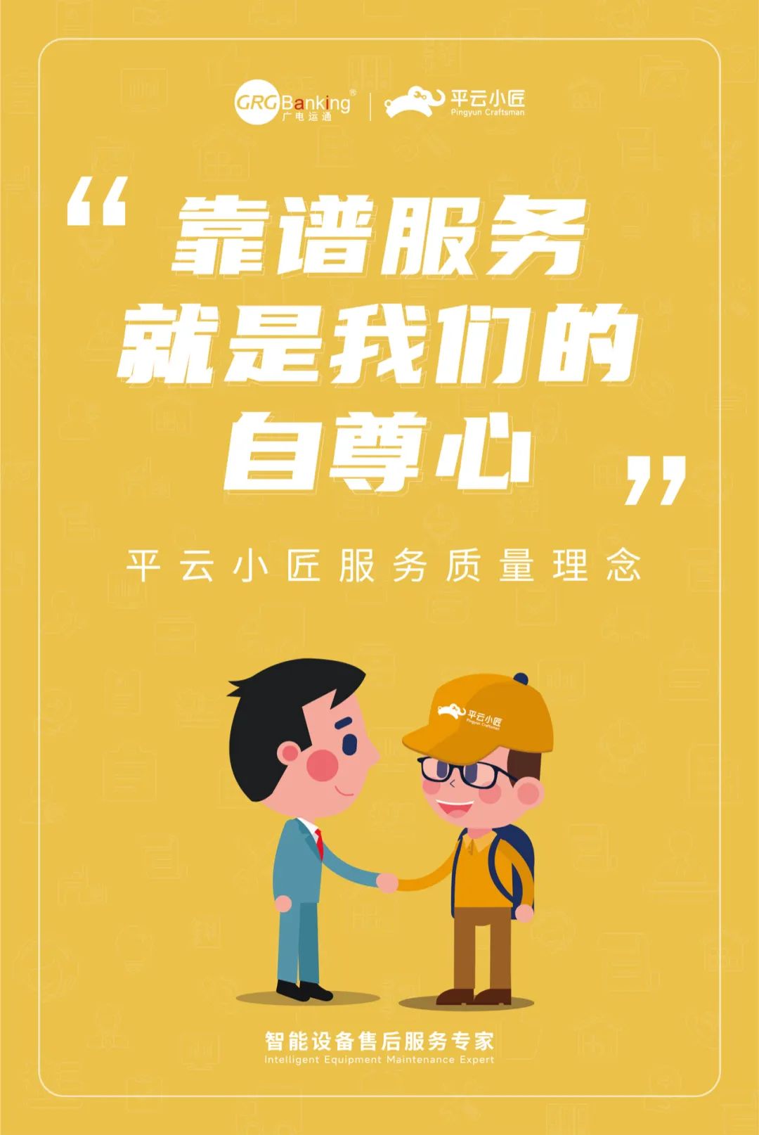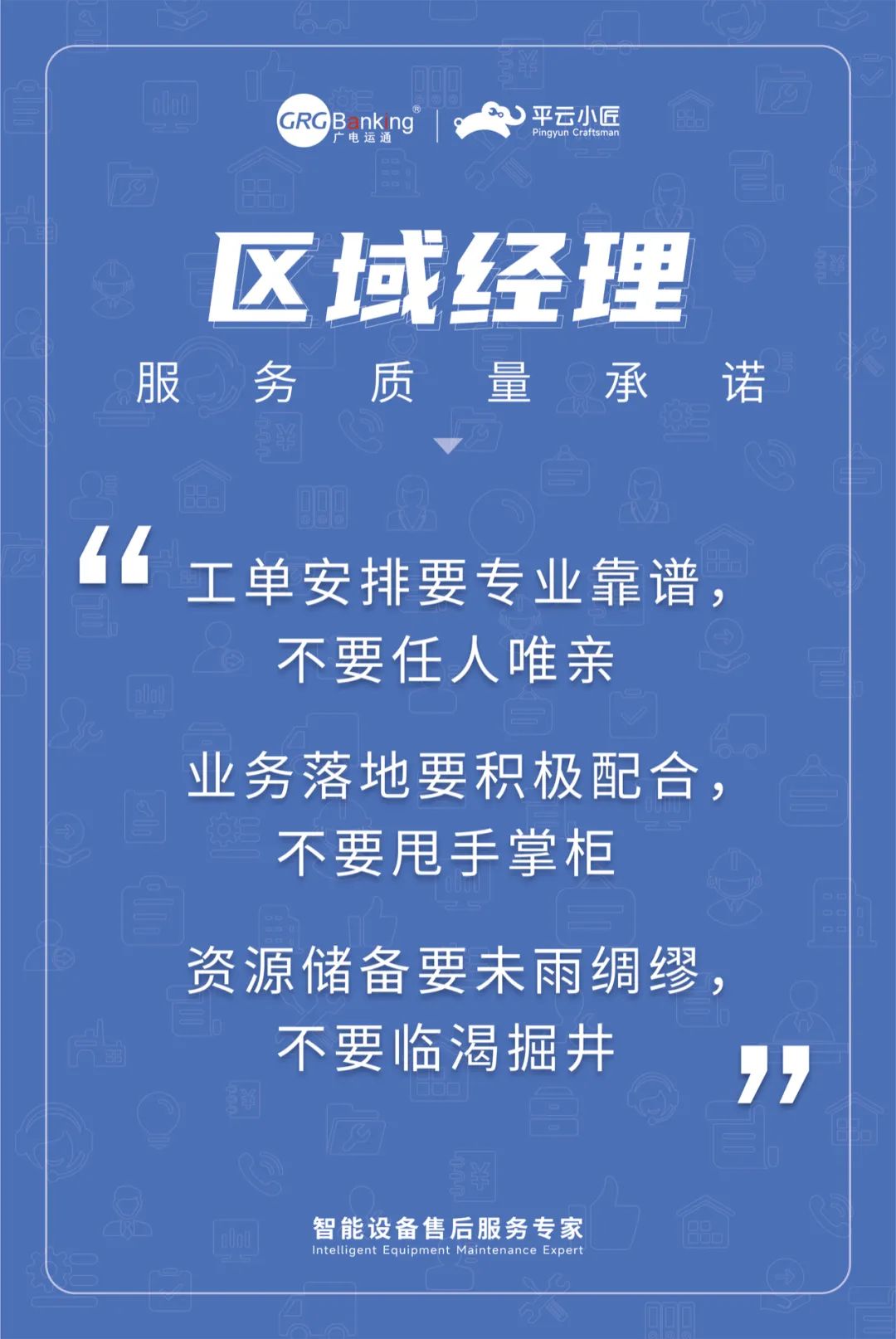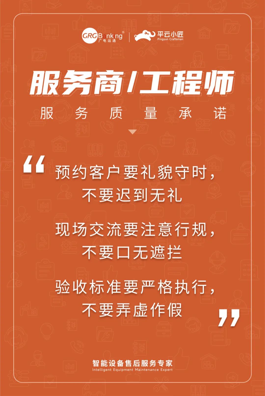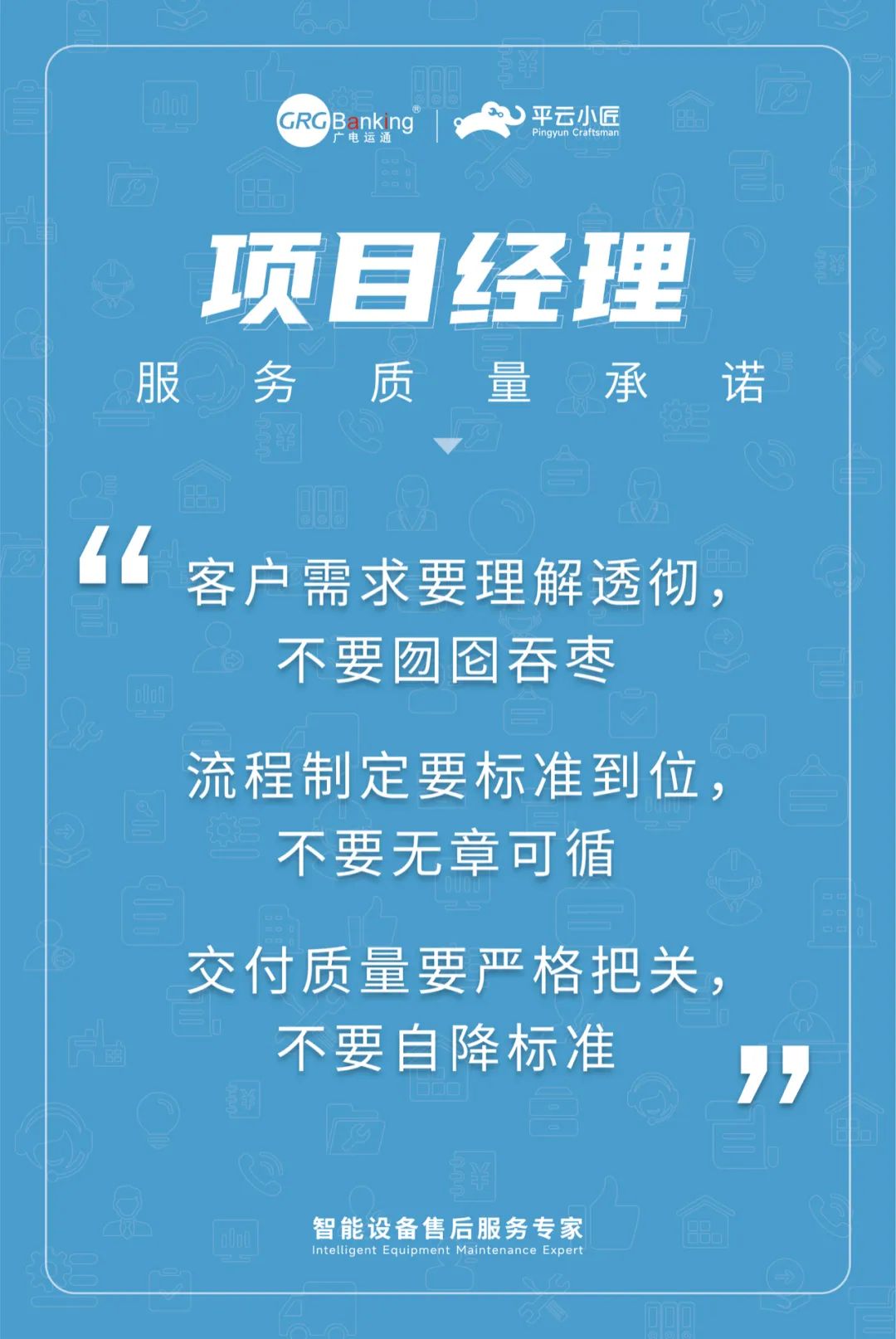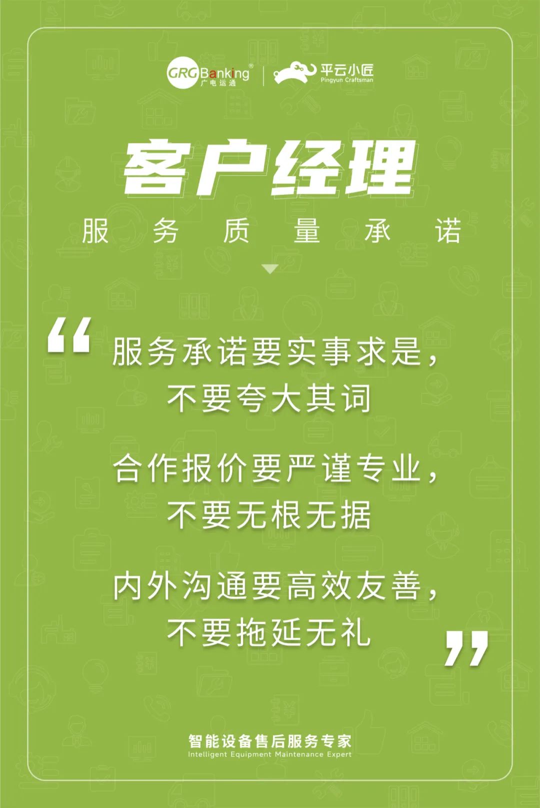 5月初,平云小匠在周年庆之际,正式发布了服务质量理念“靠谱服务就是我们的自尊心”,以及针对项目经理、客户经理、区域经理、工程师等不同岗位的服务质量要求。这些理念和工作要求,通过内部工作APP、工作会议、办公室挂画等形式,不断潜移默化。
