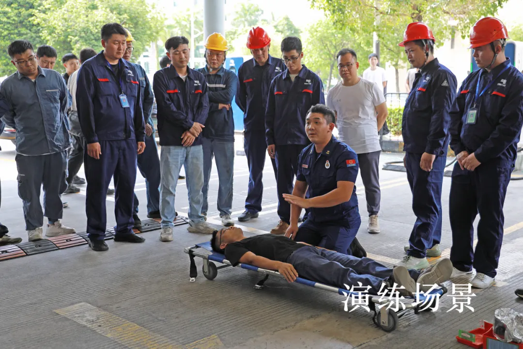 随后,现场采用模拟实操与展示讲解相结合的形式,先后进行了车辆充电自燃火灾及人身触电处置演练、防风防汛应急救援演练,以及施工现场环境事故应急救援演练。