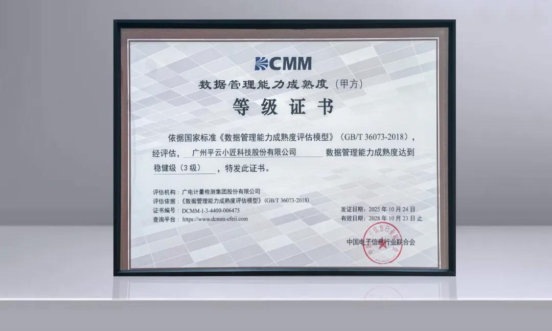 日前,经中国电子信息行业联合会评估公布,平云小匠通过国家数据管理能力成熟度模型DCMM三级(稳健级)认证,公司在数据战略、数据治理、数据应用、数据安全等方面的成熟度水平获得官方认可。